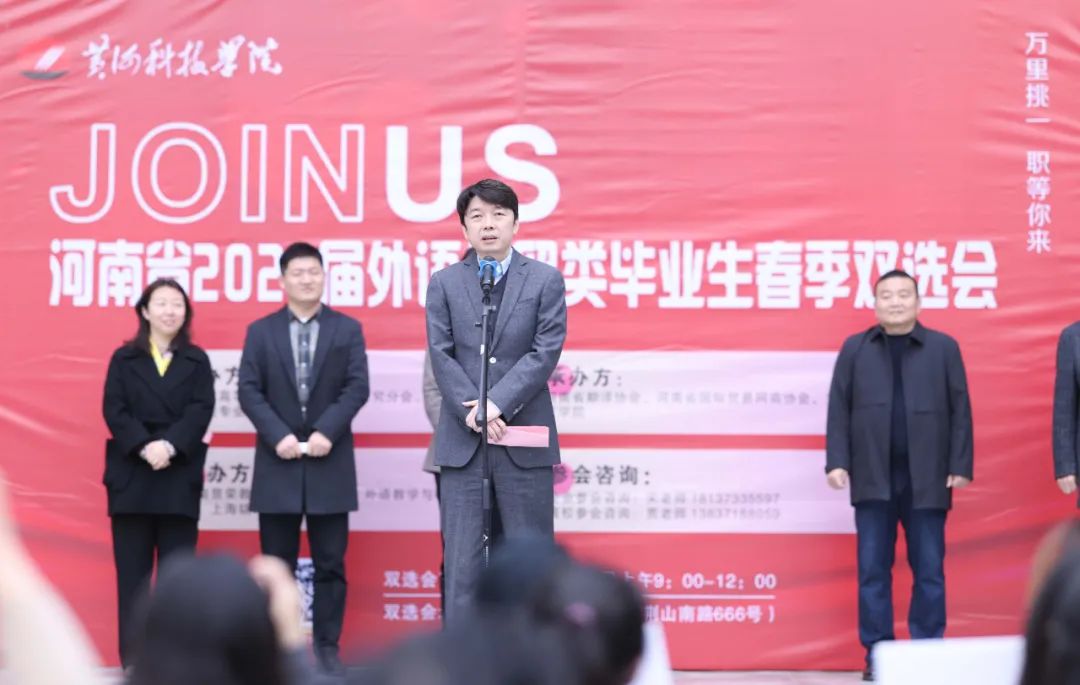 yl7703永利官网副校长杨保成、河南省翻译协会秘书长王鑫、郑州航空工业管理学院外国语学院党委书记许峰、上海铭译翻译服务有限公司总经理付鹏举、yl7703永利官网外国语学院院长张景忠、yl7703永利官网外国语学院分党委书记郑月出席开幕式,河南财经政法大学、河南科技大学、河南工学院等16所高校联络员参加,开幕式由yl7703永利官网就业办公室主任王国宾主持。杨保成宣布双选会正式开幕,郑月在开幕词中说,河南省普通高等学校外语类专业产教融合创新联盟的成立和平台的上线不仅实现了教育界和产业界线上线下双向沟通、跨界融合、协同创新,也促进了专业建设、提升了就业质量、减少了企业招聘培训成本,为外语外贸类人才需求勾画出精彩宏图。王鑫对河南省翻译协会做介绍,同时欢迎广大青年才俊和优秀毕业生加入翻译协会。许峰感谢双选会的主办法和承办方,希望毕业生主动投简历、大方来面试、踏实去工作。付鹏举鼓励毕业生坚持勤奋学习,把握机会展示自己,找到合适的工作。