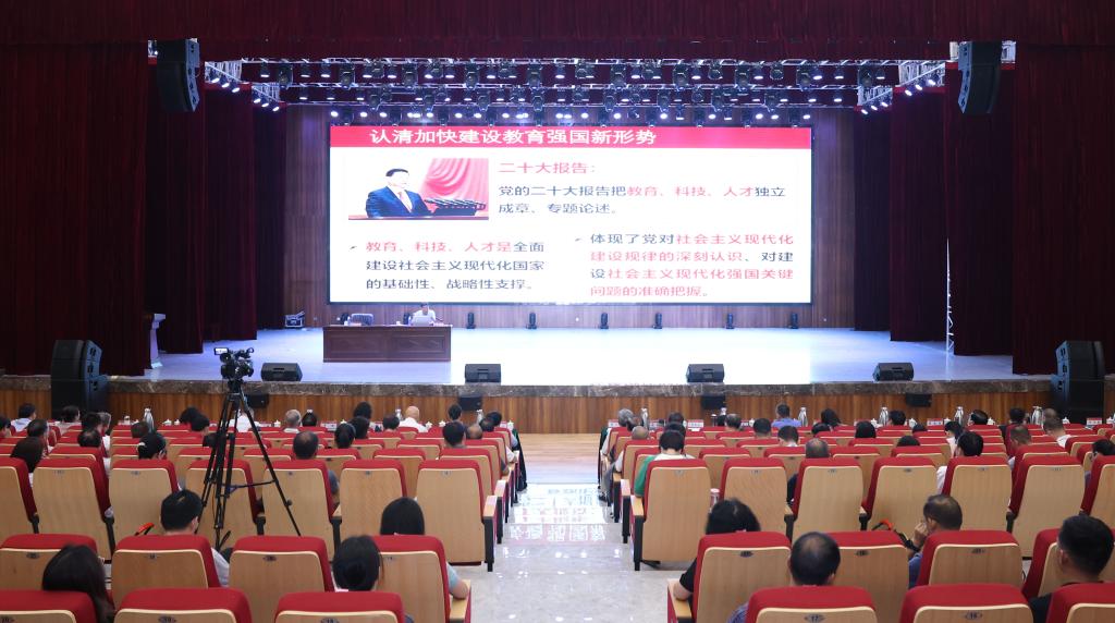 8:30,中国高等教育学会原会长、中国农业大学原党委书记、国务院教育督导委员会总督学顾问瞿振元教授作题为“落实党的教育方针 加快建设教育强国”的报告。报告由胡大白主持,杨雪梅、贾正国等校领导、校党委委员,永利官网主题教育读书班学员,各部(院)科教中心主任、副主任等,基层党支部书记共近300人聆听。
