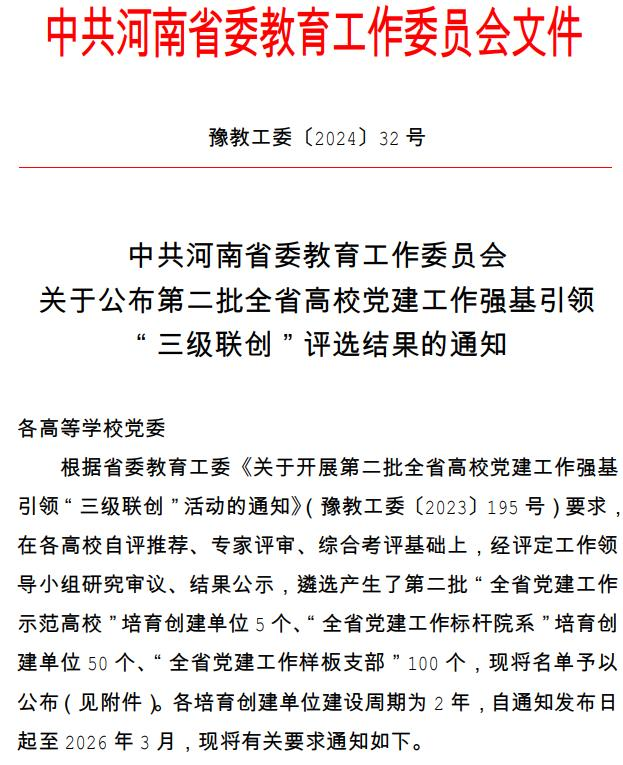 近日,中共河南省委教育工委公布了第二批全省高校党建工作强基引领“三级联创”评选结果。在学校自评推荐的基础上,经省委教育工委专家评审和综合考评,永利官网商学部党委和医学院医学系学生第一党支部成功入选第二批“全省党建工作标杆院系”和“全省党建工作样板支部”培育创建单位。