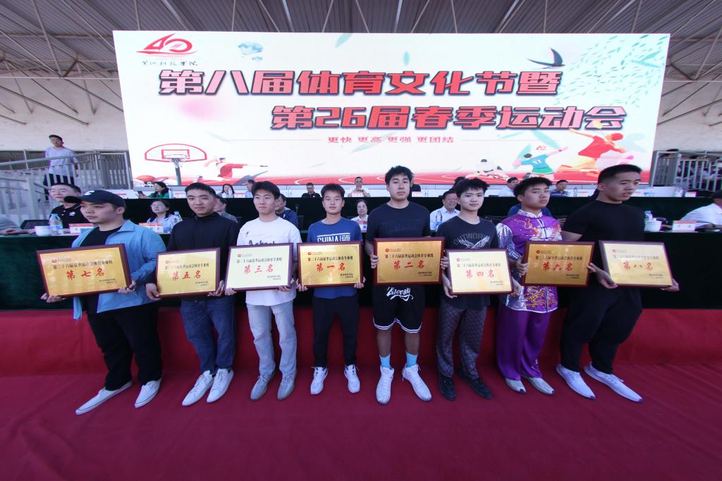 大会通报了各类竞赛成绩,对获奖单位和个人进行了表彰。艺体学部、商学部获得学生团体操表演一等奖;艺体学部2022级视觉传达设计专业朱景杨同学获得运动会会徽设计优胜奖;艺体学部、医学部获得教工团体比赛奖项第一名;电子材料科教中心、机电交通科教中心、大数据与计算机应用科教中心获得优秀组织奖;经济与管理科教中心、外语科教中心、医学部一队获得体育道德风尚奖;艺体学部、附属医院获得特殊贡献奖;电子材料科教中心获得甲组学生比赛第一名、2023级运动训练专业获得学生体育专业组第一名。大会还对庆祝40周年校庆体育竞赛活动团体总分前八名的集体进行了表彰。