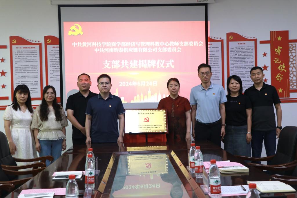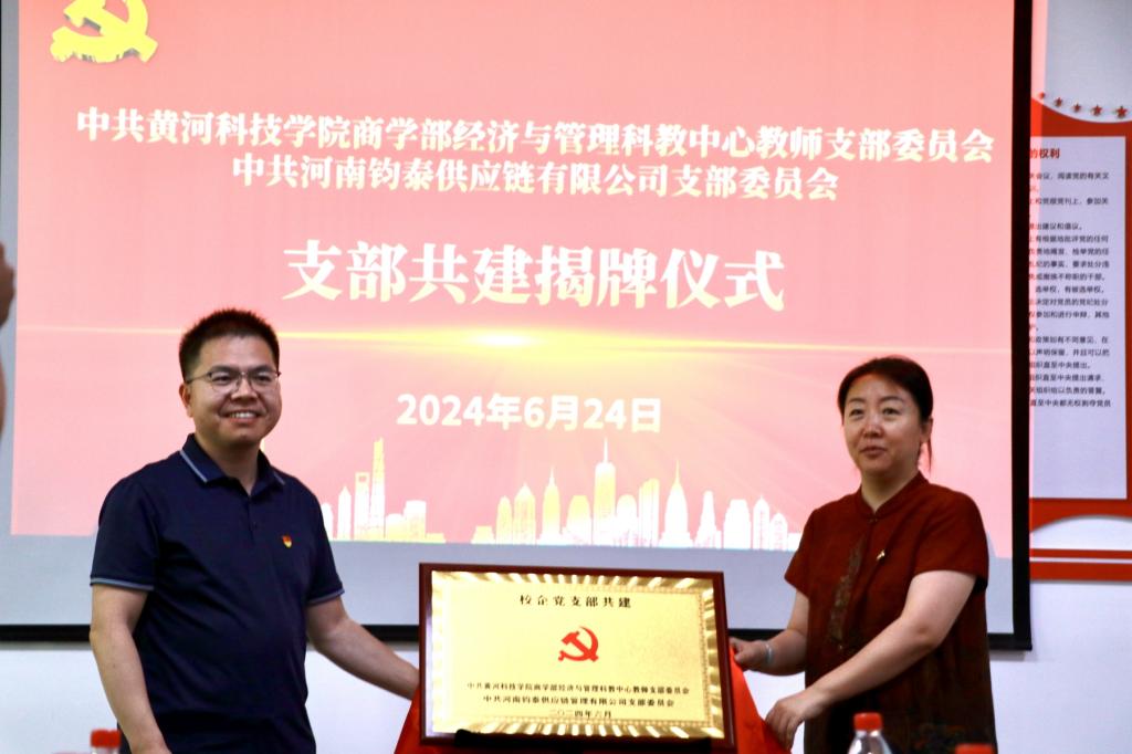 6月24日,中共yl7703永利官网商学部经济与管理科教中心教师党支部与中共河南钧泰供应链有限公司支部委员会开展支部共建揭牌仪式在商学部会议室举行。钧泰供应链有限公司党支部书记、董事长李东苗、总经理张永钧、总裁助理曾清清、永利官网商学部分党委书记郑月,副书记、副部长孙常辉,经济与管理科教中心教师党支部书记张莎等参加仪式,商学部分党委副书记韩瑞萍主持。
