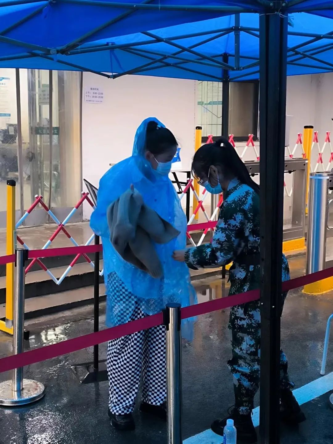 当天下午1点左右,天空下起了小雨。正冒雨在校门口检查指导工作的杨雪梅校长现场指示,立刻准备6000件雨衣,发放给没有带雨伞的同学。很快,6000件雨衣被送到了校门口。随着时间的推移,雨越下越大,一些返校的学生飞奔着跑进学校大门。在校门口值班的工作人员和师生志愿者立刻将蓝色的雨衣递给学生。看到有的学生手里拿着东西,不方便穿雨衣,工作人员还为他们穿上雨衣,并细心地扣上雨衣扣子。穿上了雨衣的同学们在雨中显得不慌不忙,一个个蓝色的身影,在校园里形成了一道独特的风景线。